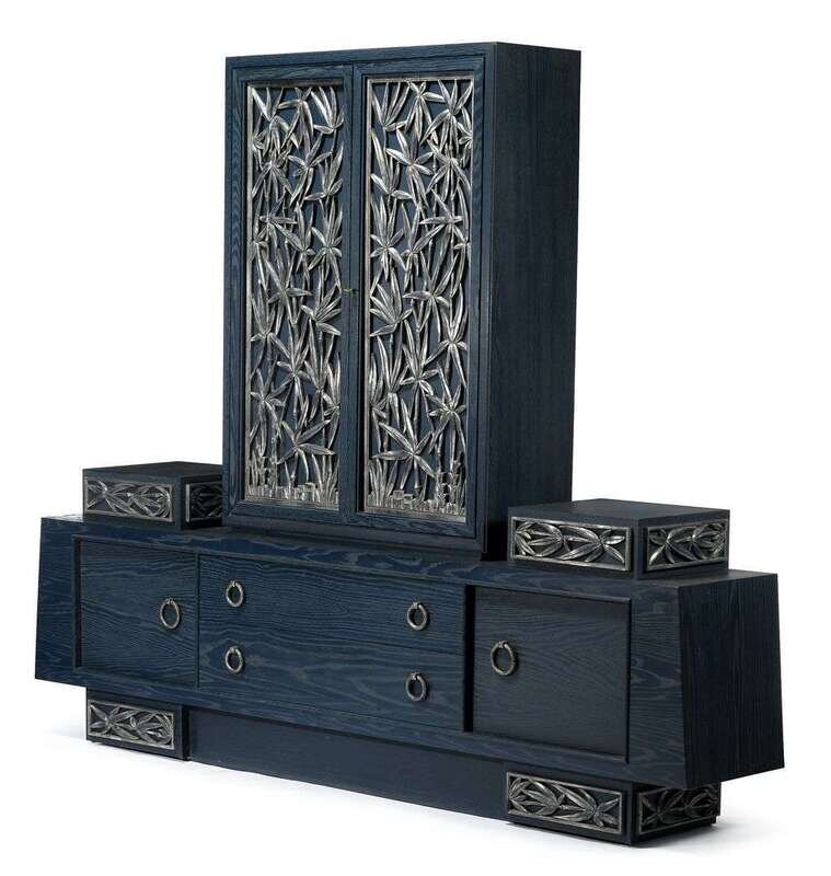 Branded, "James Mont," the carved cabinet doors open to shelves, above two drawers, the topmost fitted for flatware, flanked by two doors, blue finish with silver highlights.