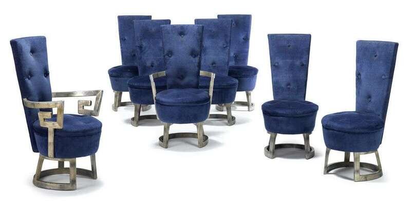 Each with tapering upholstered back above circular seat and conforming silvered wooden bases, includes six side chairs and two armchairs.