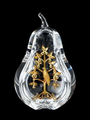 Modeled as a pear with portion cut away enclosing a gold partridge and tree, model #1014, in a fitted case. .