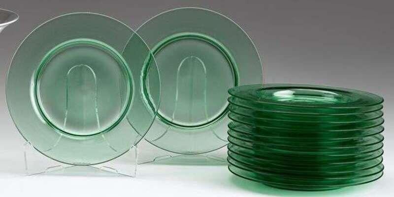 Thirteen green glass plates steuben, ohio, 20th century