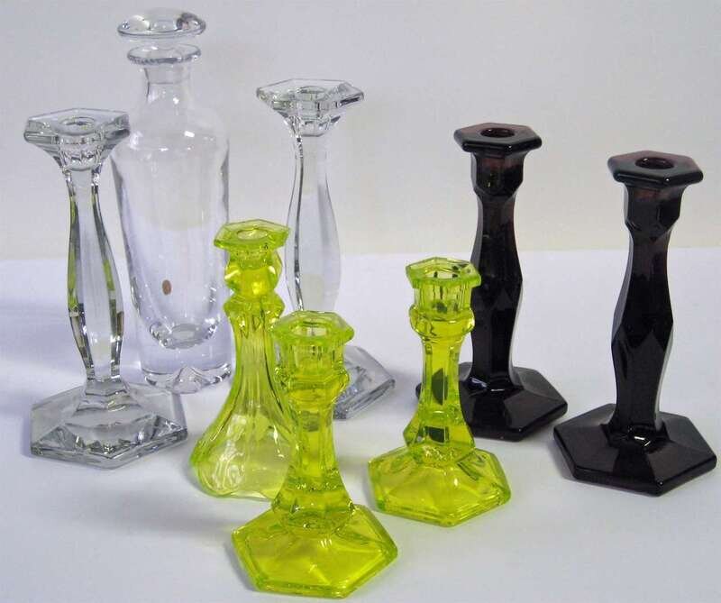 Three pair of colored and uncolored pressed glass candlesticks 20th century