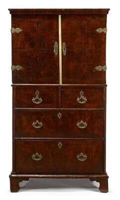 In two parts; the top with a molded straight cornice over two banded cupboard doors, opening to revealing an arrangement of doors and drawers; the lower section with two short and two long drawers, raised on shaped bracket feet.