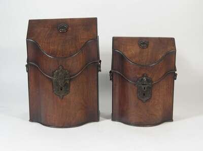 Serpentine form, the sloped hinged top with a loop handle opening to a baize fitted interiors, brass loop side handles and escutcheons.(2).