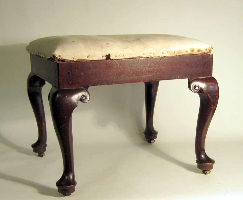 The upholstered rectangular top over a plain frieze, raised on cabriole legs with scroll carved knees, terminating on pad feet.