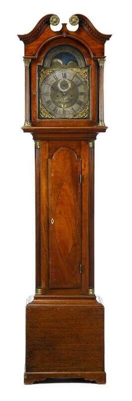 The swan neck pediment with brass mounts over a glazed door, the enameled dial with a silvered ring inscribed 'High Water At Bristol Key' over a Roman numeral dial with two winding holes and gilt metal spandrels, the case with a single arched door flanked by reeded columns, raised on bracket feet.
