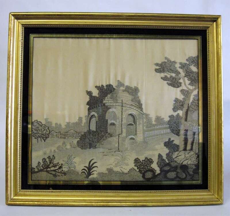 Worked in silver, grey and black thread depicting a mausoleum, initialled lower right corner, in an eglomise frame.