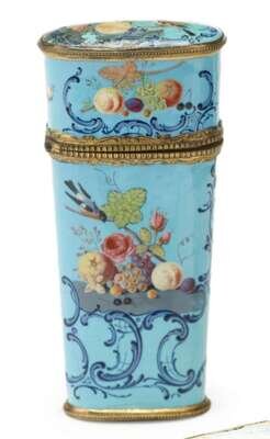 Painted fruit, birds and foliate c-scrolls on a blue ground; the interior fitted for sewing implements.