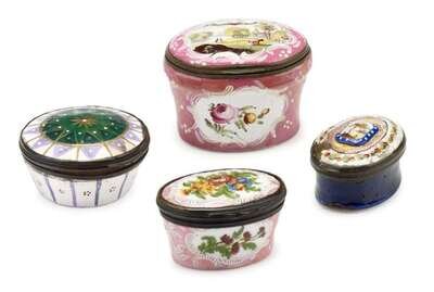 Comprising a pink example, the lid with a pastoral reserve scene; a round example with painted rosette; and two oval examples with foliate decoration, one with an interior eglomise painting of a ship at sea. (4).