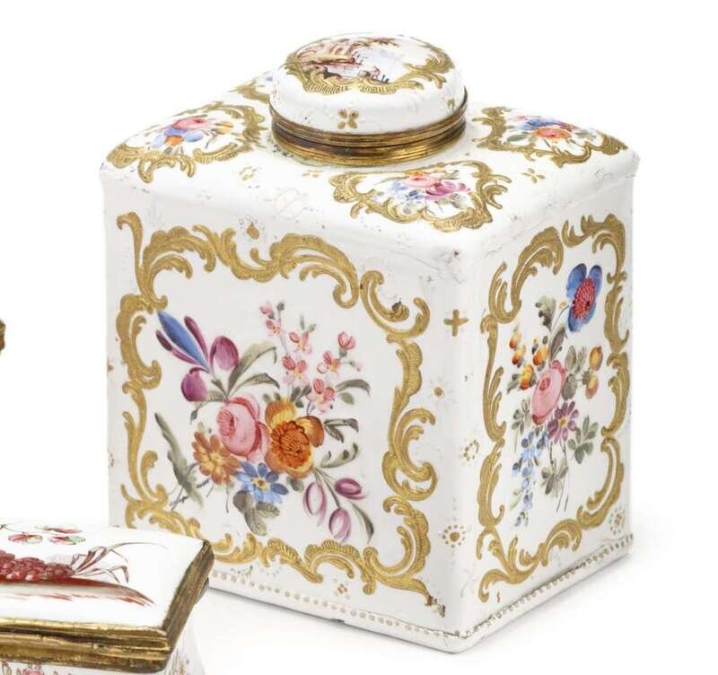 English gilt accented enamel tea caddy probably staffordshire, late 18th century