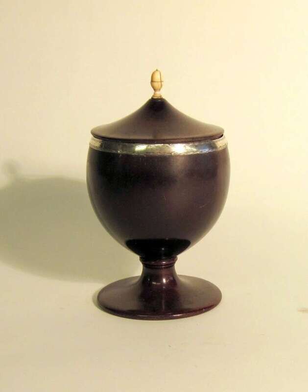The cover with a bone acorn knop, mounted with an etched silver collar and shield-shaped monogram plate, raised on a circular stemmed foot.