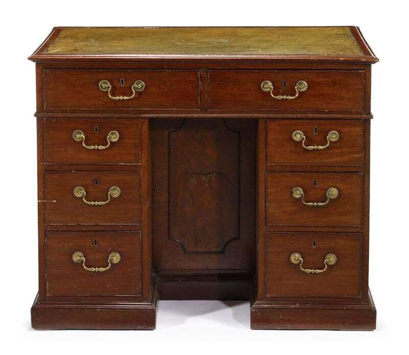 The molded rectangular top with an inset leather writing surface, above two short drawers and banks of three drawers flanking a kneehole cupboard door, raised on a molded plinth base.
