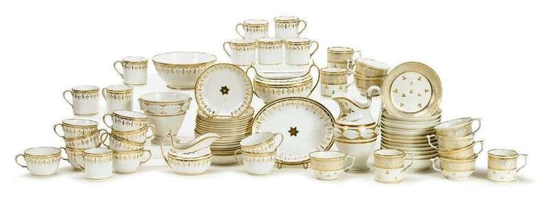 Comprising coffee cans, teacups and saucers, all with gold on a white body.