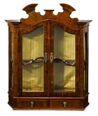 With a broken molded cornice above two arched glazed doors and side panels, and two short frieze drawers, on a molded base.