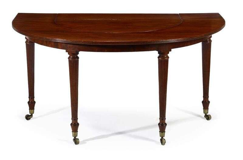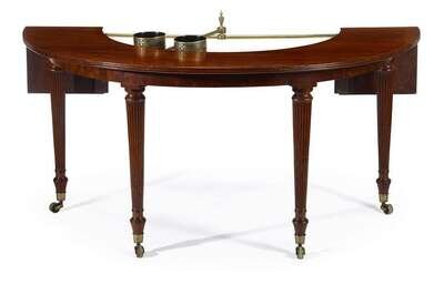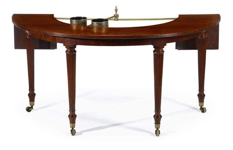 The demilune shaped top with drop leaf extensions and a removable insert center, revealing brass bars fitted with a gilt and ebonized papier-mâché double wine coaster armature, raised on reeded tapering legs, terminating on brass caps and casters.