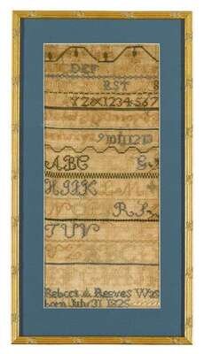 Rows of alphabets and number series, signed 'Rebecca A. Reeves was born july 31, 1825,' in polychrome silk threads on a linen ground, framed.