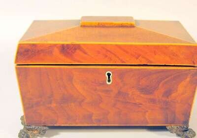 Of sarcophagus form, the interior with a cobalt glass mixing bowl and two compartments, raised on gilt metal paw feet.