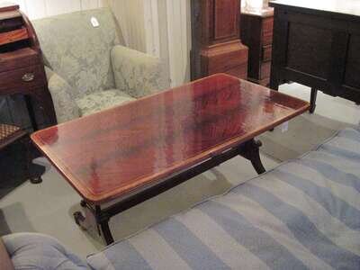 The rounded satinwood strung and banded top supported by reeded joined outswept feet terminating on brass casters.