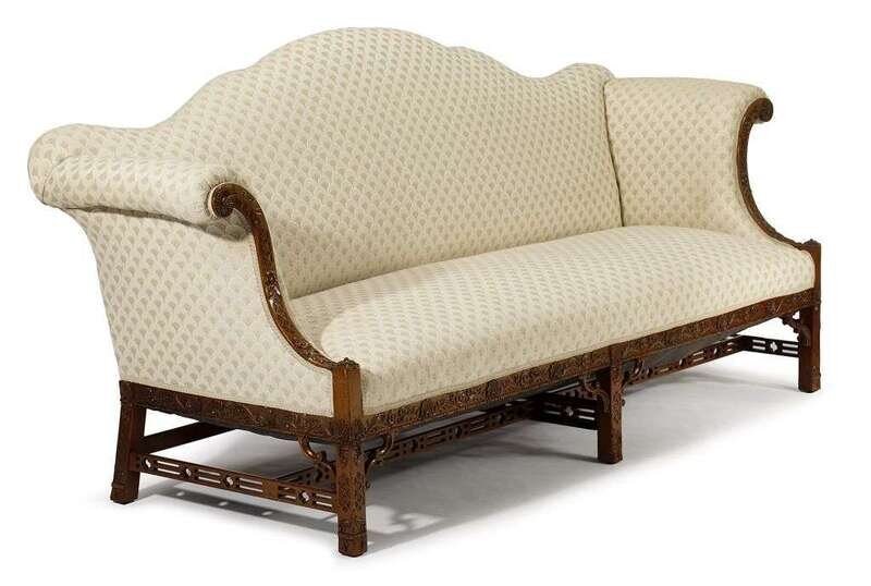 The serpentine arched upholstered back continuing to high scrolling arms with blind fret and foliate carved trim, above a scrolling foliate carved seat rail raised on square fret carved legs united by a pierced fret carved stretcher.
