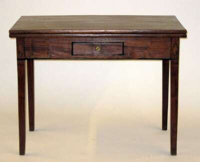 The fold-over rectangular top over an ebonized banded single frieze drawer, raised on square legs with shell inlaid capitals.