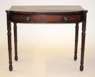 The rectangular top with outset rounded forecorners, above a long frieze drawer, raised on ring turned legs.