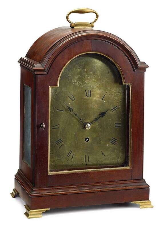 With a molded domed cornice with brass loop handle, above a glazed door enclosing an engraved brass Roman numeral dial with one winding hole, inscribed 'Mich Iris/ Lewis', raised on stepped molded base and raised on brass ogee bracket feet.