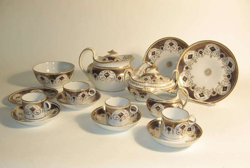 Comprising a teapot, sugar bowl, creamer, waste bowl, 3 coffee cans, 2 dessert plates, 3 side plates and a teacup; decorated with with gilt accents and cobalt. (approx. 13).