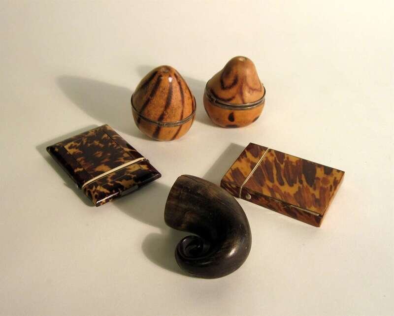 Comprising two tortoiseshell card cases; two silver mounted gourd snuff boxes; and a ram's horn. (5).