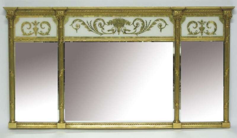 With a carved breakfront cornice above white and gilt eglomise panels centered by urns, above a divided mirrorplate flanked by garland wrapped half columns.