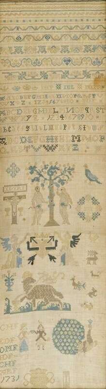 English School 'Adam and Eve' needlework sampler probably german, dated 1731