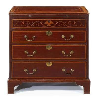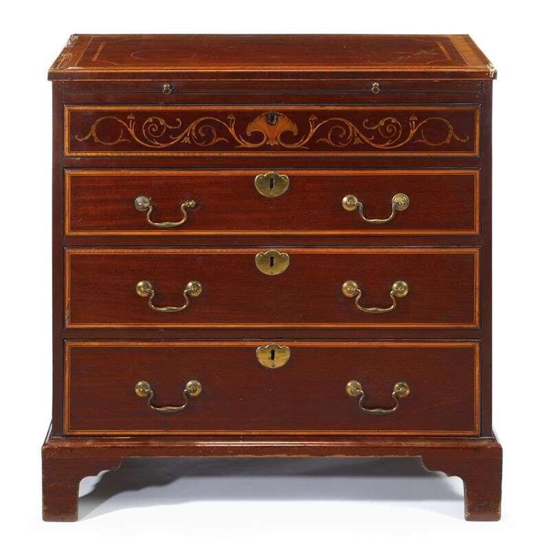The molded banded and inlaid top over a brushing slide, above four drawers, the first with foliate inlay, raised on molded bracket feet.