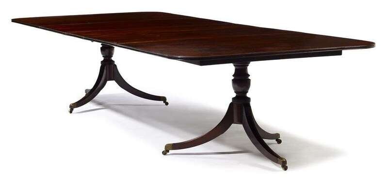 The D-shaped ends with three leaf extensions with a reeded edge, raised on turned column supports and fluted outswept legs terminating on casters.