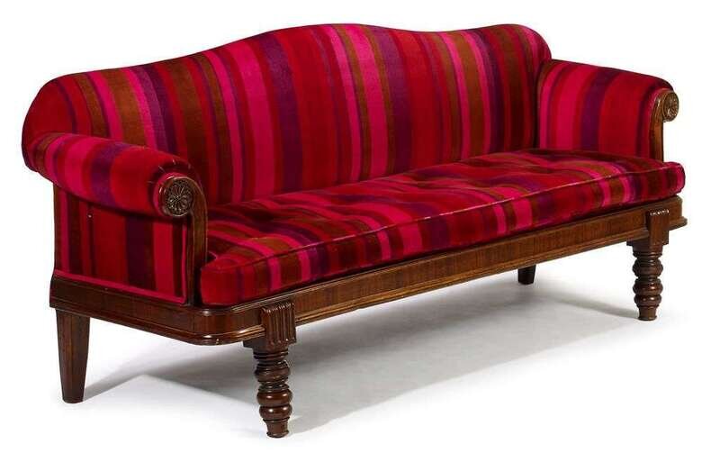 The serpentine padded back continuing to scrolling arms with carved mahogany rosettes, over a loose cushion seat, above a molded seat rail raised on turned forefeet.