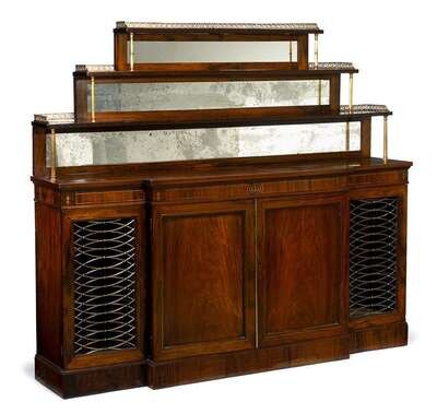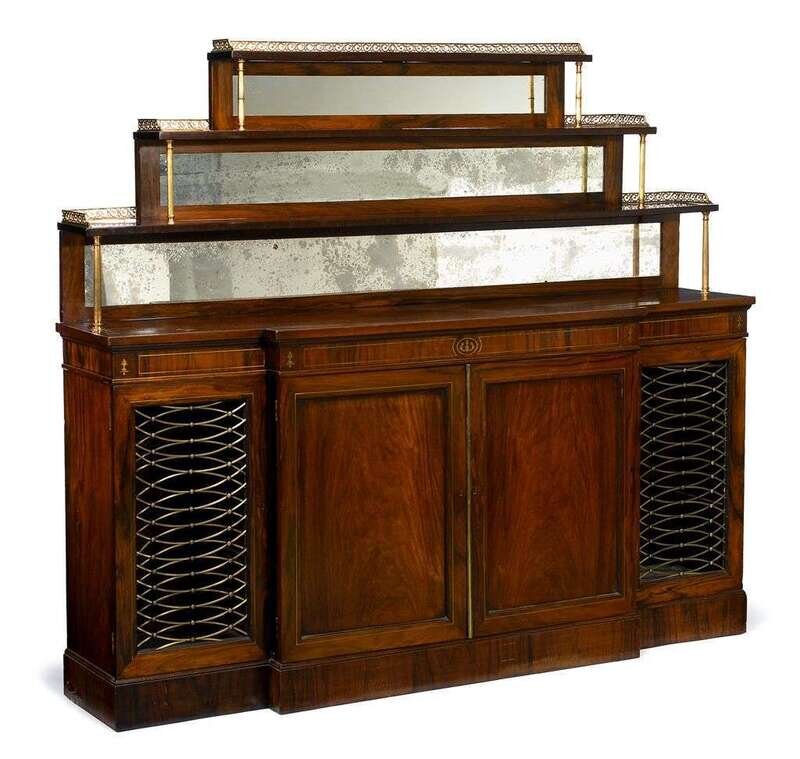 The rectangular top of breakfront outline surmounted by three graduated mirrored tiers with brass galleries and gilt metal column supports, all above a central pair of brass lined cupboard doors flanked by two grille insert doors, raised on a confroming molded base.