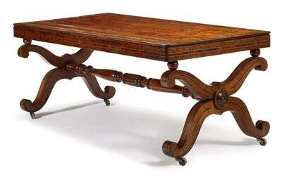 The rectangular inlaid and mahogany banded top over conforming frieze raised on X form scrolling end supports joined by a turned stretcher.