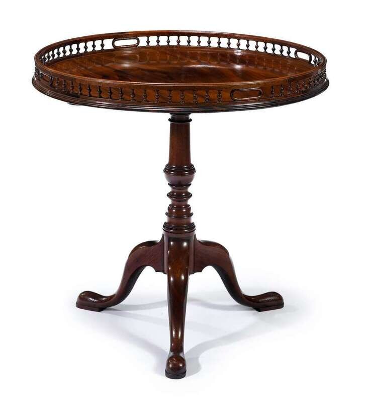 The circular tray top with a spindle gallery with loop handles, raised on a baluster turned column on a tripod base ending on pad feet.