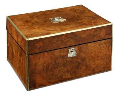 Rectangular, centered by a monogrammed abalone cartouche, the interior fitted with compartments and a gilt red leather writing surface, secret drawer to lower section.