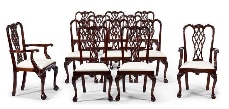 Comprising two armchairs and ten side chairs; each with a pierced vasiform splat above a drop-in seat, raised on foliate carved cabriole legs ending in ball and claw feet. (12).
