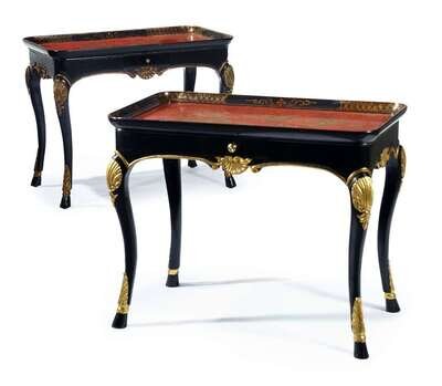 Pair of George II style ebonized, japanned and parcel gilt tea tables 20th century