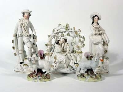 Comprising a group depicting lovers under a bower; a hunter and companion; and a pair of sheep spill vases. (5).