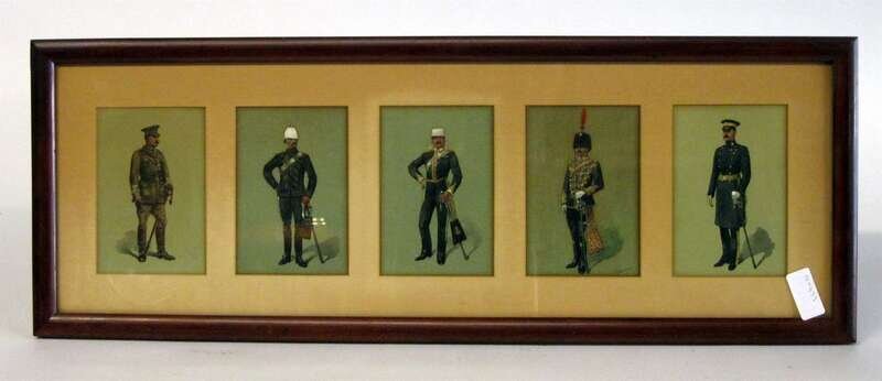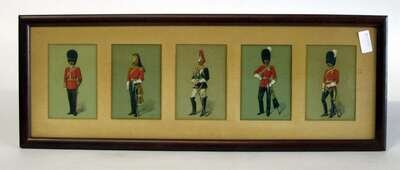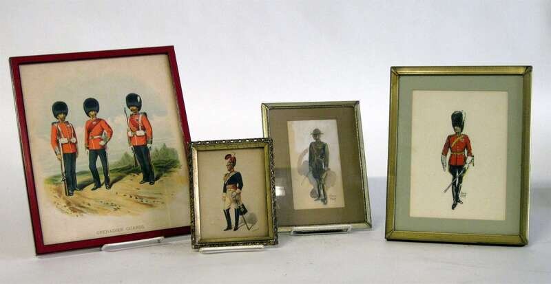 Each depicting various dress and standard uniforms for dragoons, hussars, guards, and others, some framed and identified, most loose.