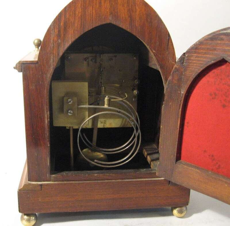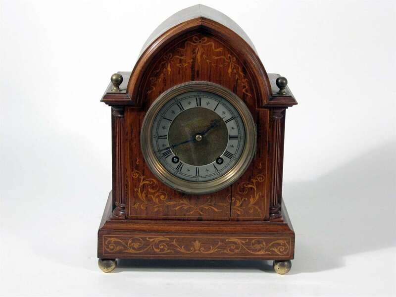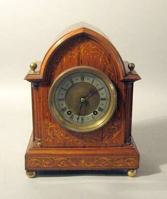 Edwardian rosewood and marquetry Gothic Revival mantel clock early 20th century