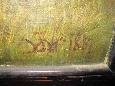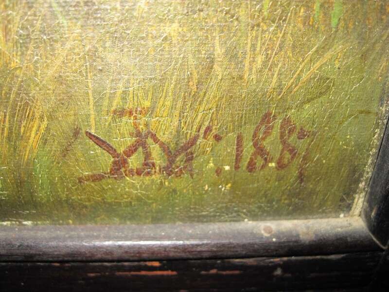 Each panel with a pierced carved cornice above a painted continuous Scottish highland landscape scene with a hunter and his horse, dogs, and stags; each panel with artist's monogram and dated 1887.