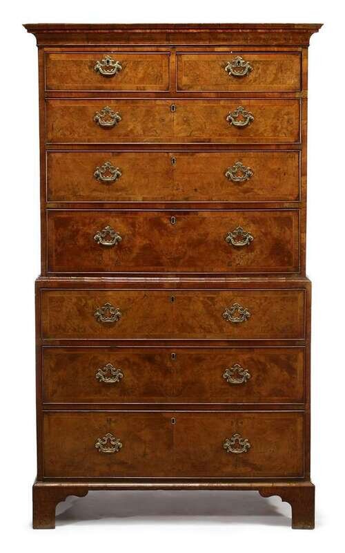 In two parts; the molded cornice over two short and three long crossbanded graduated drawers; the base with three further graduated drawers, raised on bracket feet.