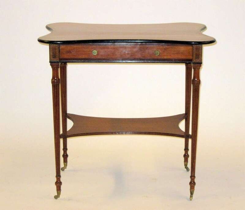The shaped rectangular top over a single frieze drawer, raised on tapering reeded legs united by a conforming undertier, terminating on brass casters; maker's label to underside.