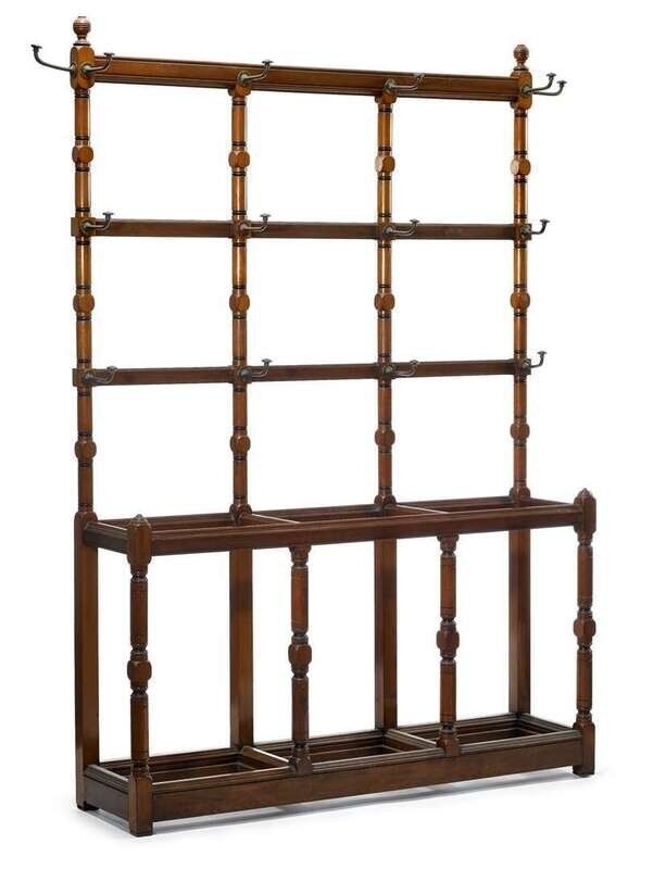 The four turned and partially ebonized uprights joined by three horizontal rails mounted with hanging hooks, above a rectangular compartmented stick stand base, on a raised on square feet; the liner inserts lacking.