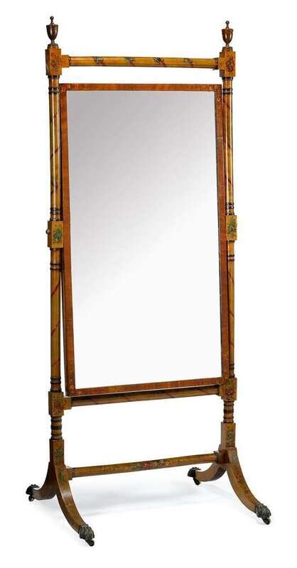 Edwardian painted satinwood Coronation cheval mirror retailed by hampton & sons ltd., london