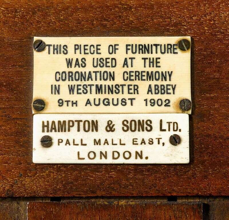 The pivoting rectangular mirror plate supported on cylindrical posts with urn finials and painted with floral garlands, raised on a trestle base with splayed legs ending in casters; the reverse with an ivorine plaque inscribed 'This Piece of Furniture was used at the Coronation Ceremony in Westminster Abbey/ 9th August 1902'.