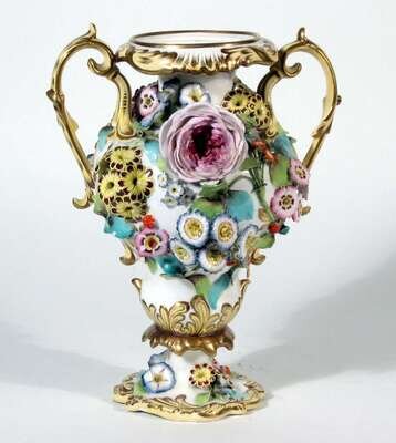 Of baluster form, with two foliate scroll handles, the body applied with large flowerheads, raised on a rococo scroll foot.