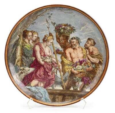 Circular, painted with a scene depicting Diana's return from the hunt, printed mark.