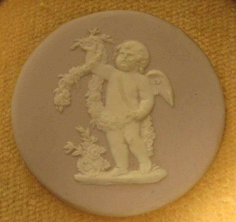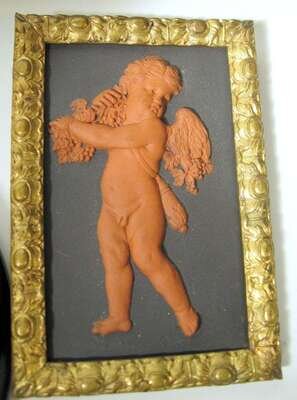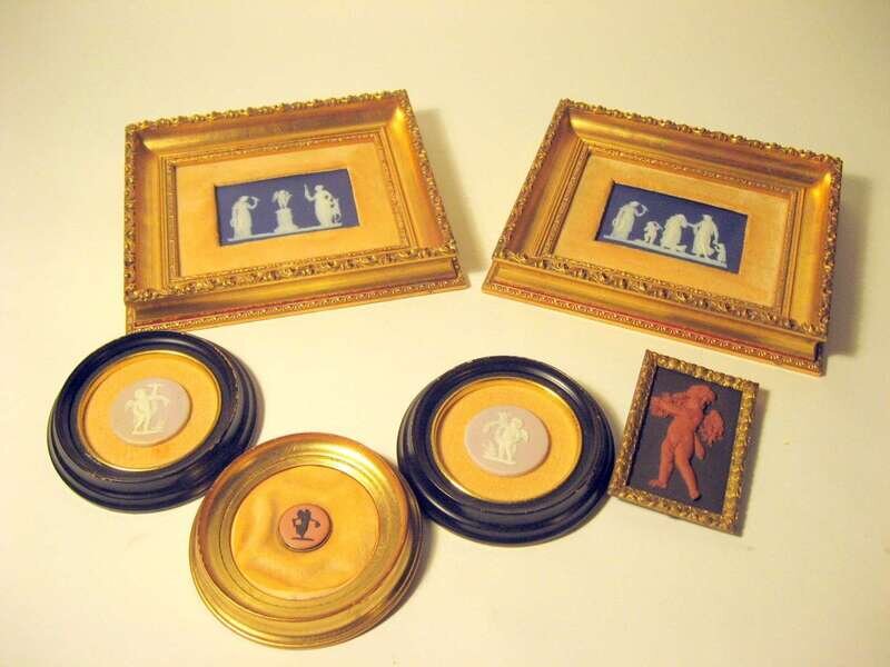Comprising a pair of rectangular plaques with Classical scenes, a pair of round purple and white plaques of putti, a rectangular black and red plaque of a standing putti and a small pink and black round plaque; each mounted in frames. (6).